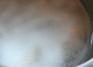 På middels varme smeltes 3 dl sukker i en vid kjele til lys brunt og flytende. OBS!! dette er varmt og må håndteres med forsiktighet. Finn fram den formen du skal steke puddingen i, den må romme minst 2 liter, og hell karamellen i formen. Det anbefales ikke å bruke springform ettersom puddingen stekes i vannbad og den vil nok trekke inn noe vann !
