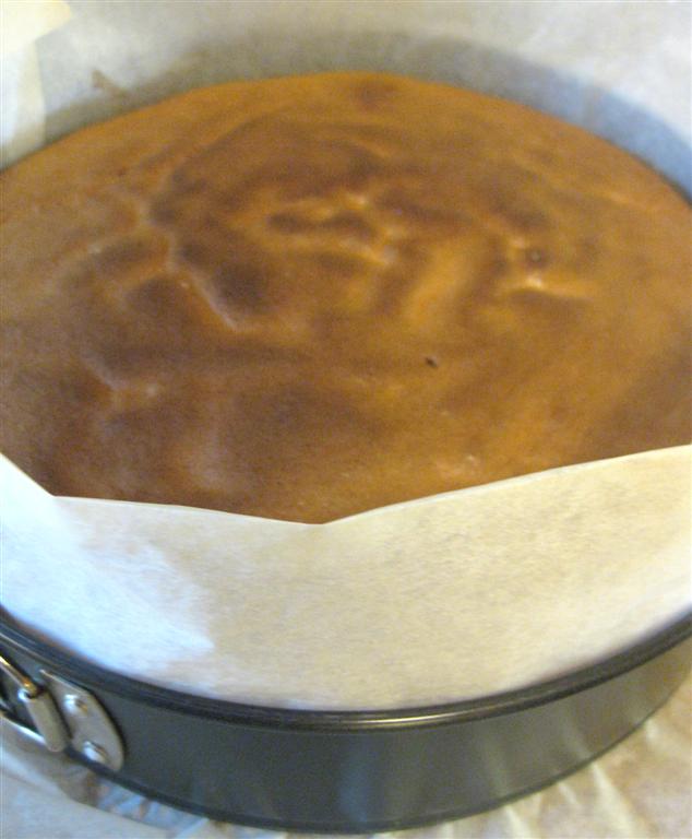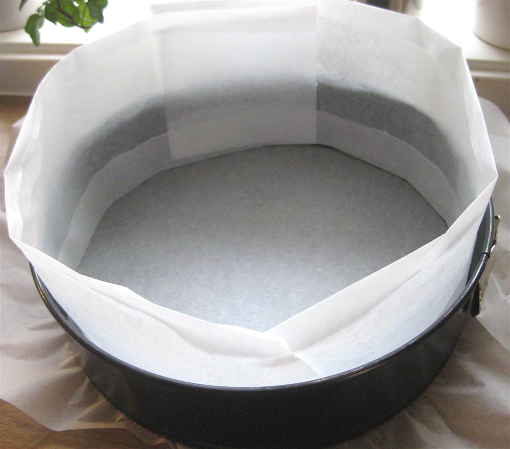 Kle en springform med bakepapir. Jeg kler også kantene så slipper jeg føre en kniv langs kanten for å få ut kaken og slipper å skade theflon belegget i formen.