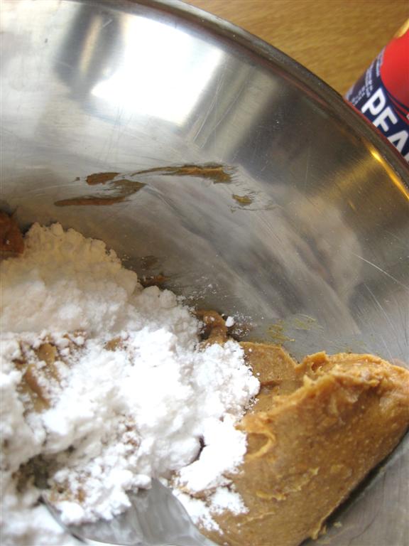 Bland peanøttsmør og melis i en bolle og bland godt med en gaffel. For å lettere kunne forme fyllet i kakene så ha gjerne peanøttsmøret kaldt.