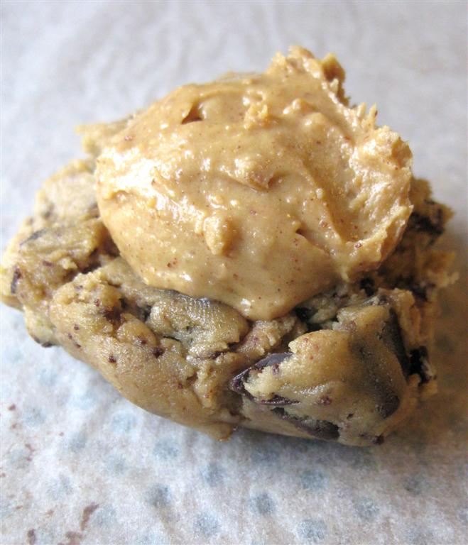 Ta cookideig, ca 40 gram, legg vekk litt av det til lokk. Form en grop i deigen og legg en ca 1 ts peanørrsmørblanding i gropen. Legg resten av cookiedeigen på toppen og prøv å dra sammen rundt peanøttsmøret. Gi cookien et lite lett trykk.