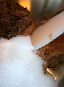 Denne lages uten maskin. Rør sammen peanøttsmør og brunt -og hvitt sukker.