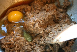 Pass på at det ikke er kluper i brunsukkeret. Rør inn egget og bland godt.