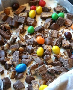 Liker du peanøttsmør og Snikcers sjokolade tror jeg denne er noe for deg. Jeg var litt i tvil om jeg skulle lage et innslag på denne, for jeg var redd den ble for heavy med alt innholdet, men i en bursdag testet jeg den ut på gjestene og de var enstemmig enige om at denne måtte jeg dele. Ennå er det sjokolade igen i vasen, men cookiesen er vekk for lengst 🙂