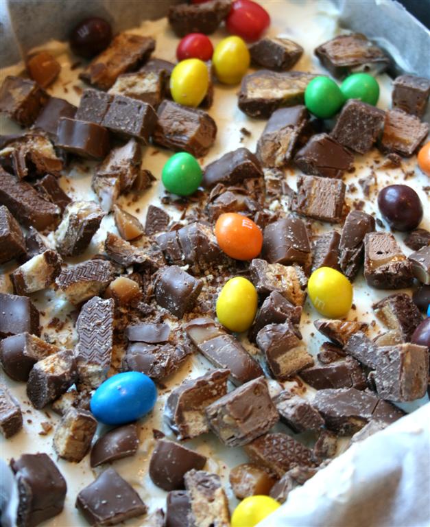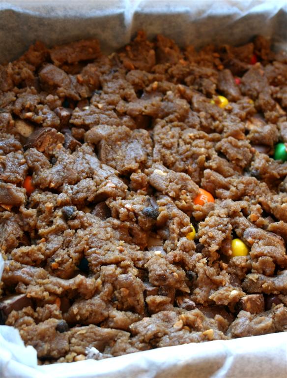Strø et jevnt lag goodies over ostekremen før resten av cookiedeigen fordeles som et lokk på toppen.
