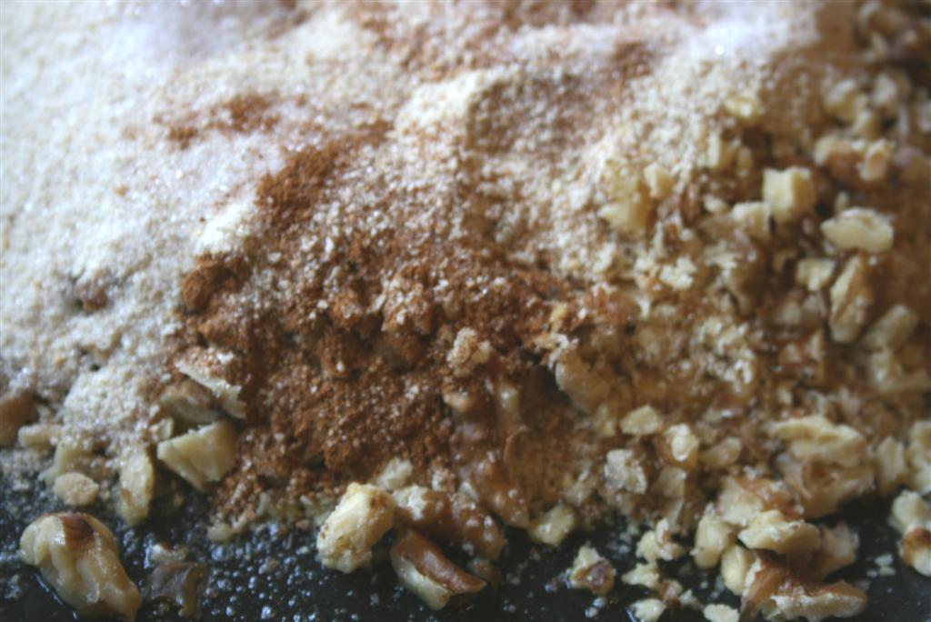 Varm en stekepanne og smelt i smøret, ha i strøbrød, mandler, hakket valnøtt, sukker og kanel og stek det gyllent. Avkjøles !