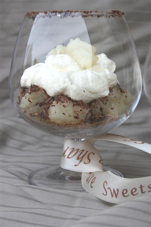 Begynn med strøbrød i bunnen, ha så over eplemos og så krem, gjenta til du er fornøyd med posjonens størrelse og utseende. Strø sjokolade mellom lagene eller på toppen, eller begge deler 🙂