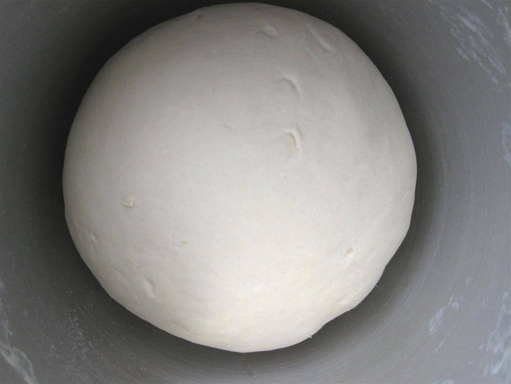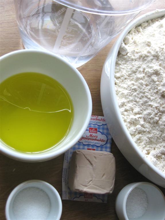 Lunket vann, sukker og gjær blandes og ha i 5 ss av olivenoljen.