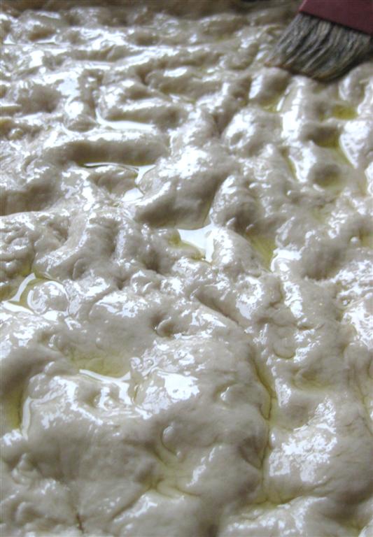 Smør en stor langpanne eller bakebrett med et par spiseskjeer olivenolje, og begynn å klemme deigen ut i formen. Klem fingertuppene ned i deigen så den blir ujevn og gropete. Ha resten av olivenoljen over deigen og pensle den utover.