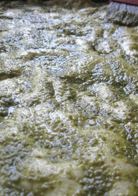Smor pestutover, i dag hadde jeg et glass jeg har kjøpt, legg ca 6 – 8 ts pesto utover deigen og pensle den utover og til slutt strøs over noen nyper med havsalt eller flaksalt.