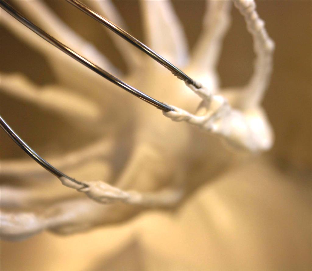 Mens ennå maskinen går for full speed, tilsettes gelantinoppløsningen i en tynn stråle over tid og la maskinen gå i ca 15 – 20 minutter. Tilsett smak og farge etter eget ønske.
