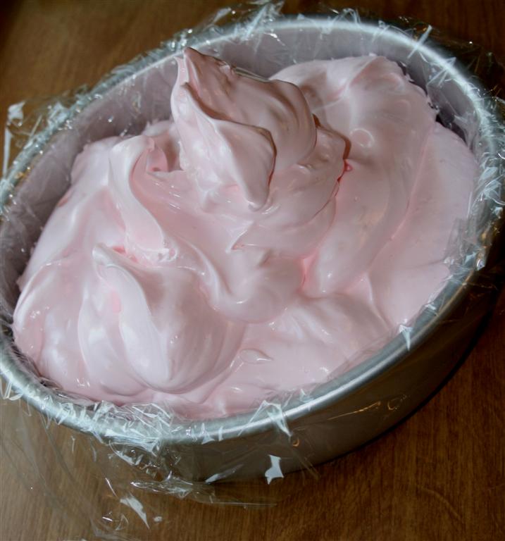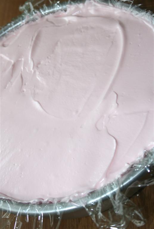 Kle en bolle med plastfolie/gladpack og fyll i «deigen». Prøv så forsiktig som mulig fordele det jevnt utover og prøve å ikke få luftlommer.
