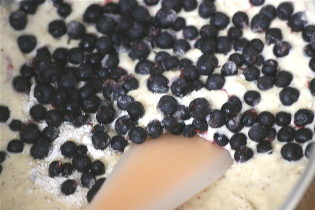 Blåbærerene tilsetter jeg mens de ennå er frossene og vender inn i deigen med en slikkepott. Jobb så lite som mulig så ikke røren blir helt blå, så du beholder mest hele bær.