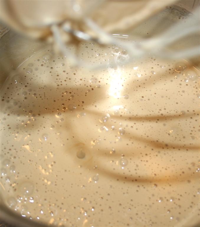 Med litt forsiktighet blandes alt nå sammen til en tyktflytende og litt seig røre. Test konsistensen ved å ta røre med en spiseskjed. Den skal kunne helles av skjeden, samtidig som det må hjelpes til litt å skyve med en annen skjed.