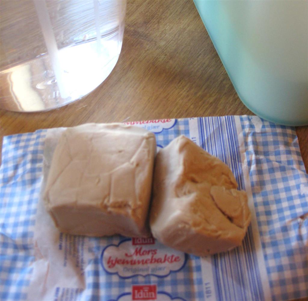 Når frøene har stått i vann en time, er det klart for å sette i gang gjæren. Mål opp 7.5 dl lunket vann, ha i en ts sukker, og rør ut gjæren i vannet og dekk til i ca en halv time.