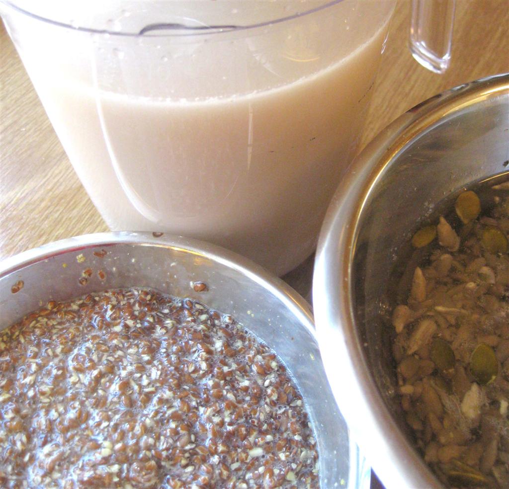 Start en times tid på forhånd med å bløtlegge solsikkefrø og gresskarfrø i en bolle, bruk riklig med vann som siles av før frøene skal i deigen.