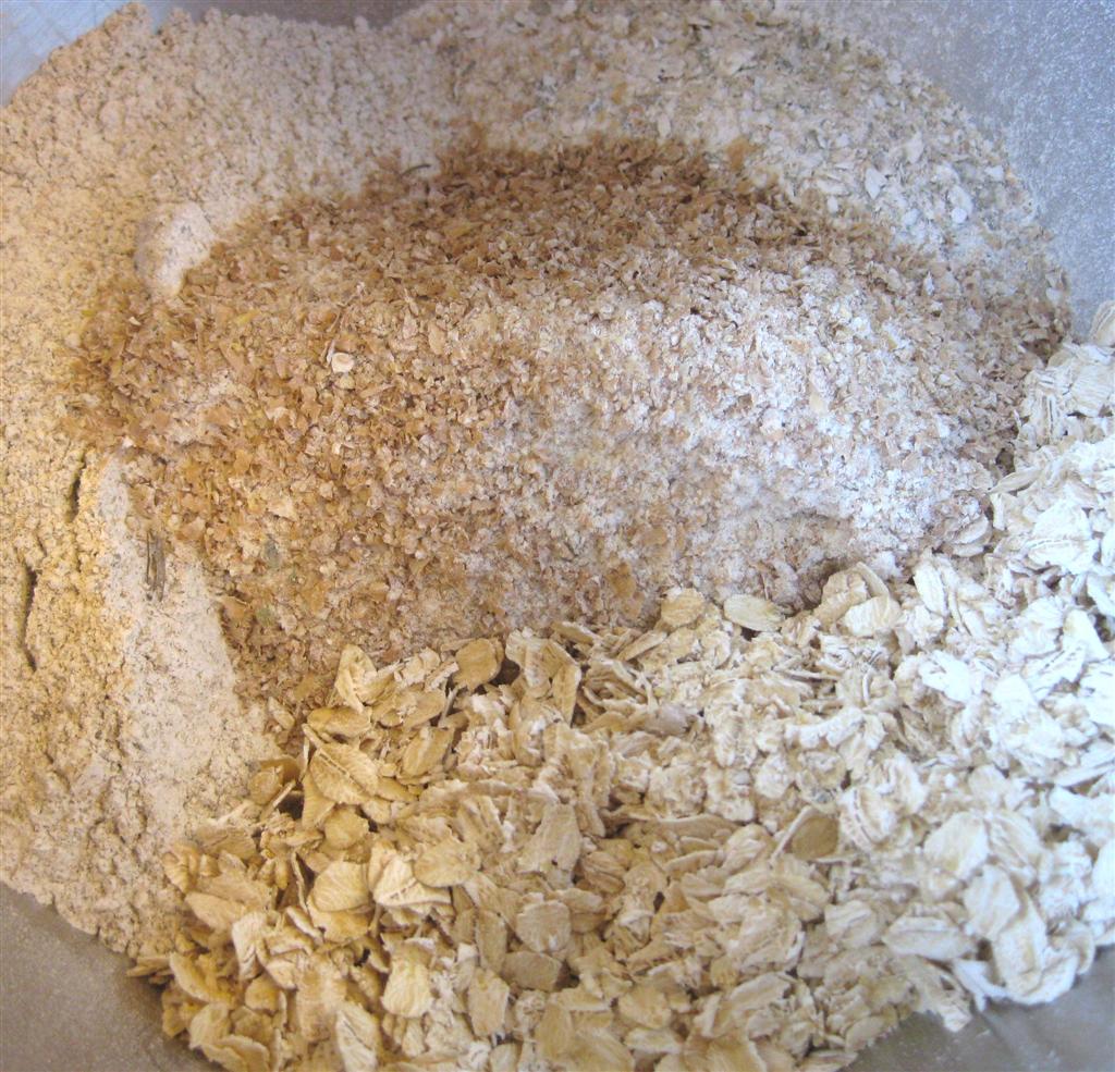Mens du venter på gjæret kan du måle opp resten av ingrediensene. Alt melet untatt hvelemel har du i bakebollen ha også i havregryn og salt. Hvetemelet har du i en liten bolle for seg.
