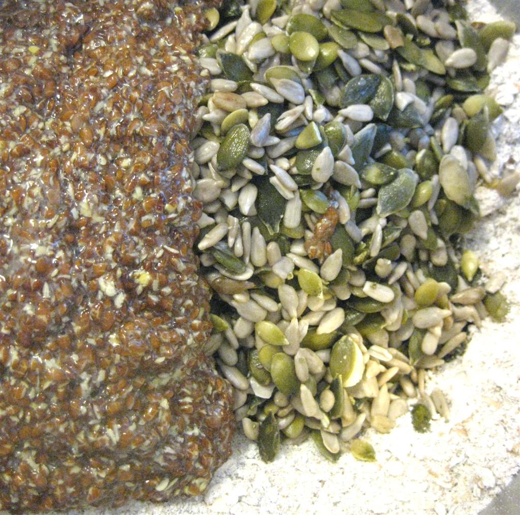 Sil av vannet på frøene og ha de og linfrøene i bakebollen. Da er det bare å sette i gang og mens maskinen går tilsetter du gjæret og rapsoljen. La dette gå i noen minutter så alt er blandet i en litt løs velling. Det er sikkert nødvendig å stoppe opp å skrape veggene og bunne i bollen så du får alt med inn i deigen.