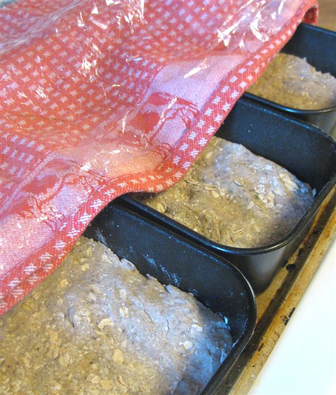 Del deigen i tre like store emner og kna ut brød. Jeg drysset havregryn på benken og rullet de i det. gjør klar tre brødformer sprayet med formfett. Klem brødene forsiktig ned i formen.