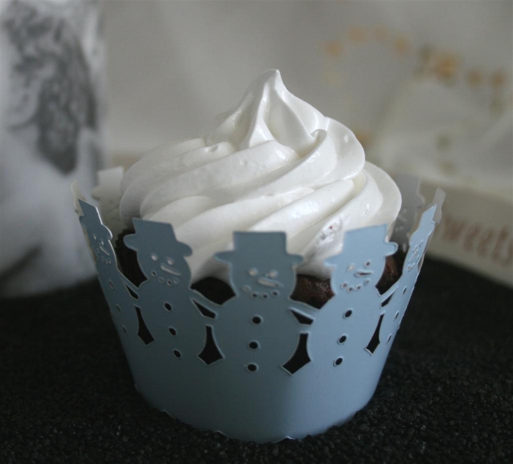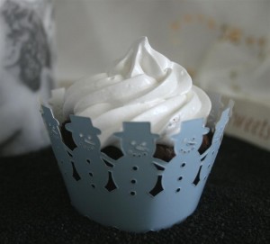 To-sidig (lys blå/hvit) snømann cupcake party wrap og sprøyteposer på rull av 100 stk, har jeg kjøpt av: