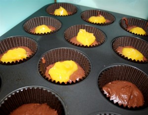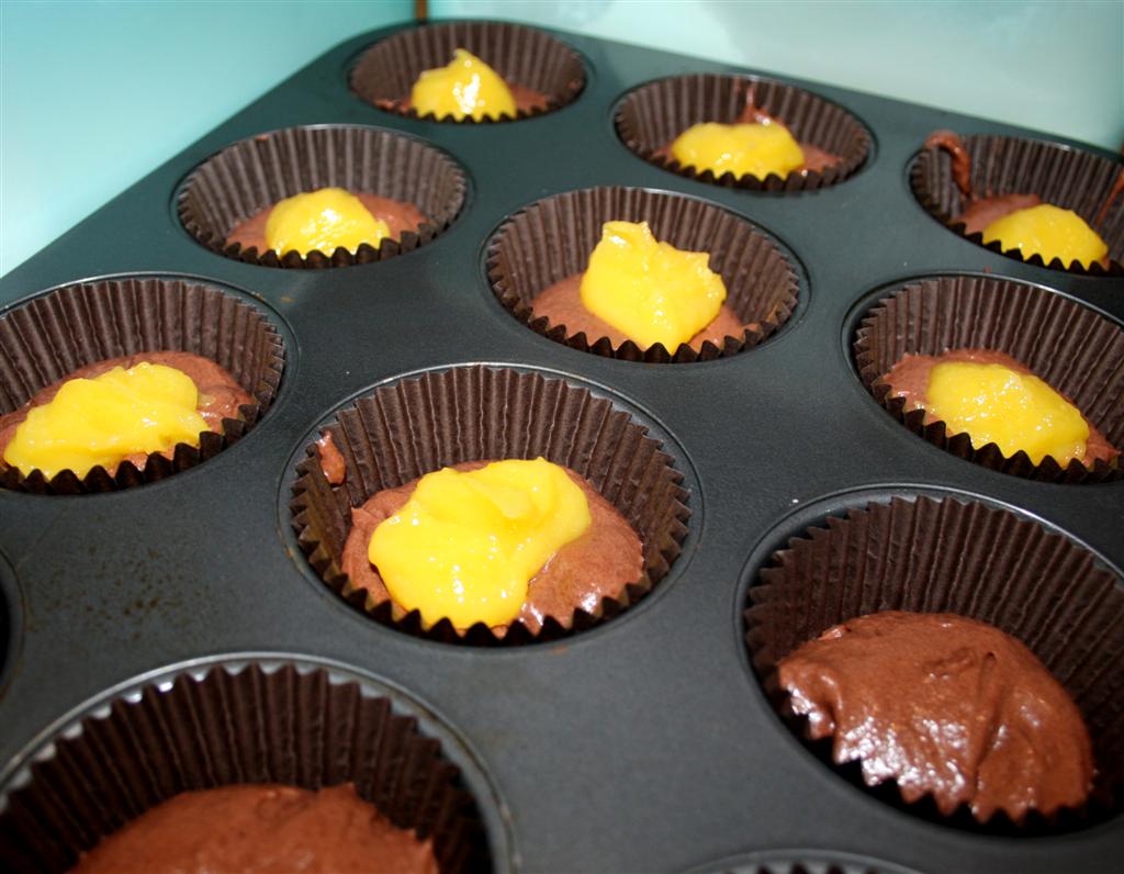 Ha 1 ss røre i bunnen av hver form. Deretter legges 1 ts sitron krem i hver. Til slutt toppes det med enda 1 ss muffins røre.