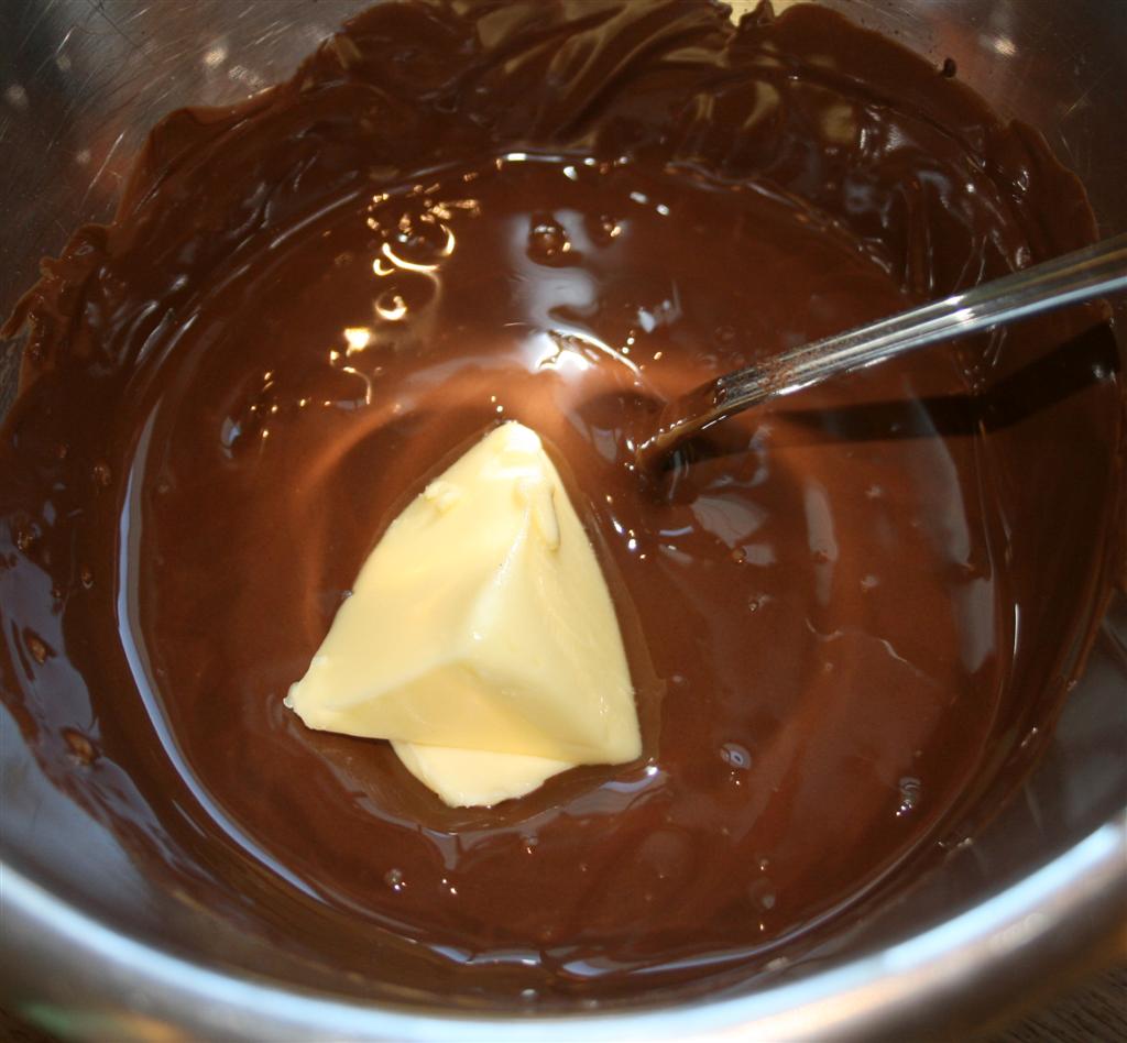 Chop the chocolate and melt half of it in a double boiler. Add the butter and let it melt in the chocolate .