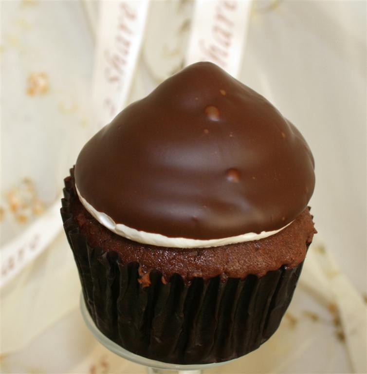 Take the cupcakes straight from the fridge and give them a quick dip in the chocolate. It is ok to held them upside down, so the excess chocolate drip off.