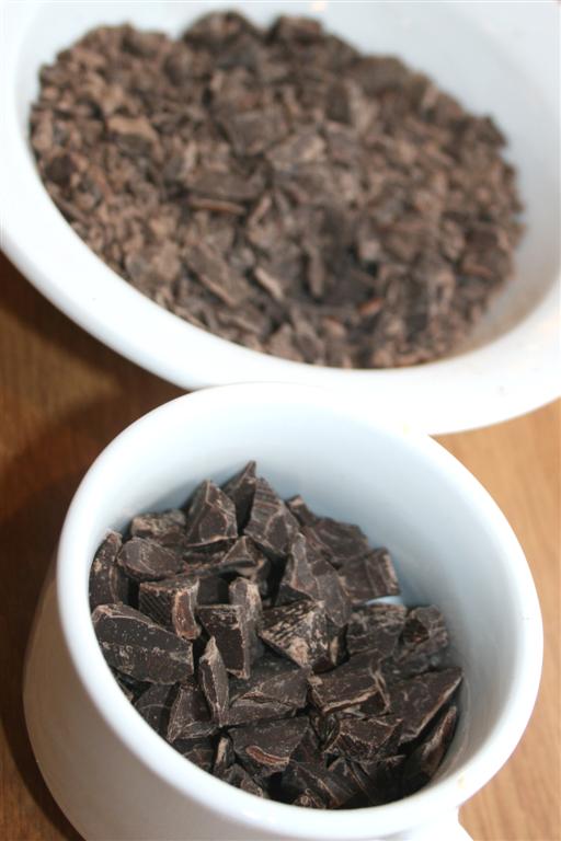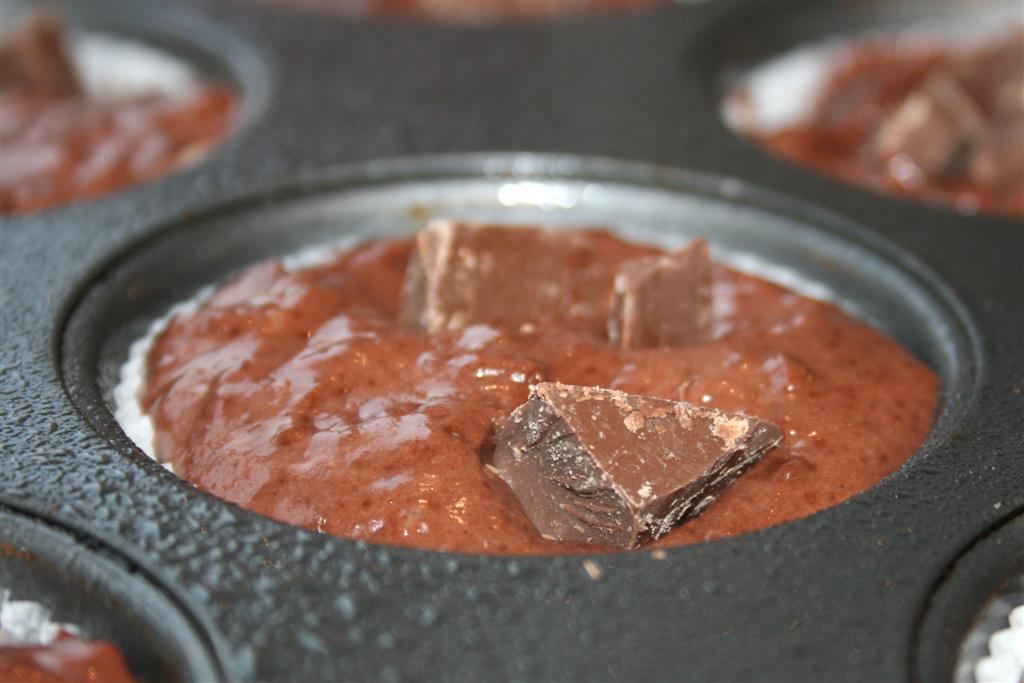 Den hakkede sjokoladen sorterte jeg litt så jeg fikk noen fine biter å strø på muffinsen før steking.
