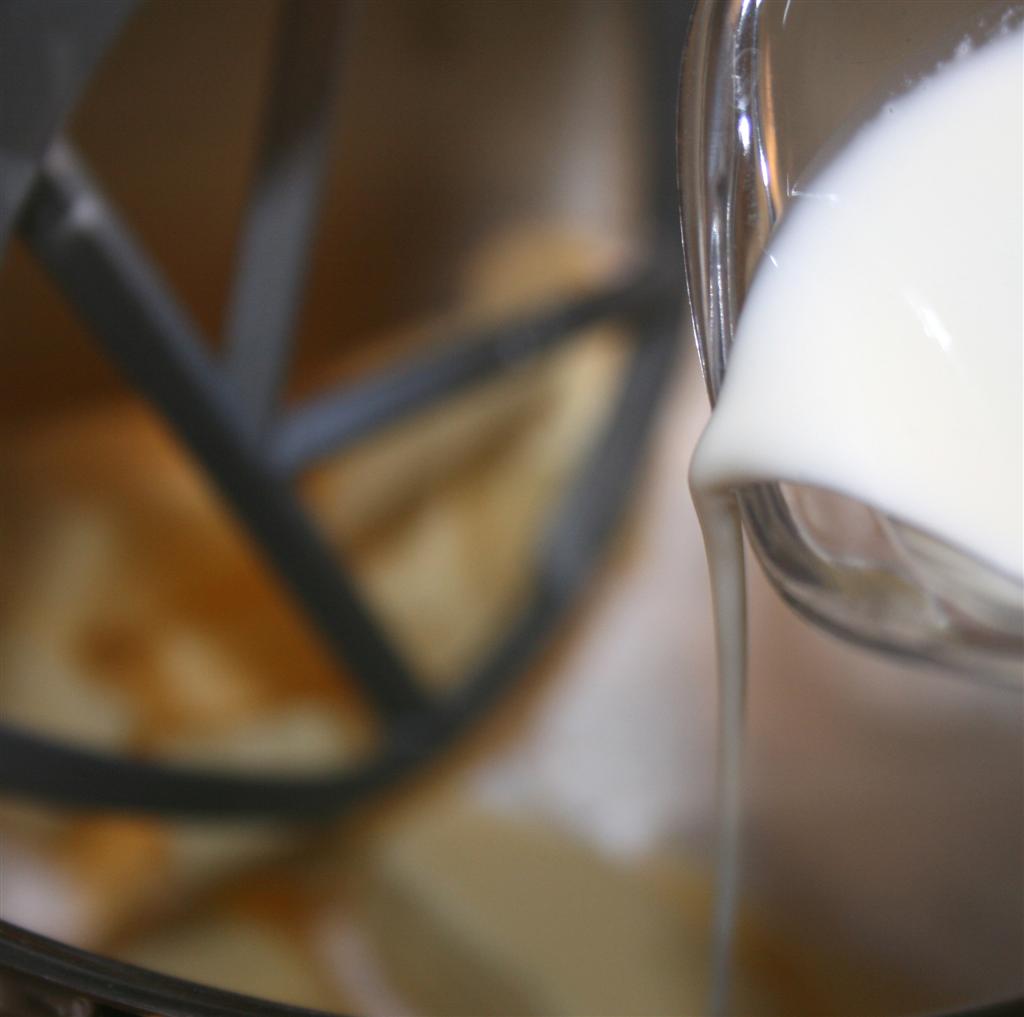 Set machine on low speed. Start by adding 1 /3 of the flour and then quickly add half of the milk. Followed of next 1 /3 flour and the remaining milk. Finally, add rest of flour.