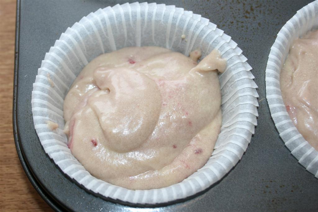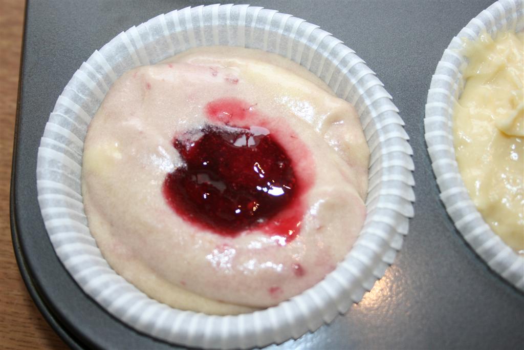 The rest of the jam you can poure into the center of eash cup before baking, using a teaspoon. … or you can fill the cupcakes as soon as they come out of the oven using a piping bag and a tip.