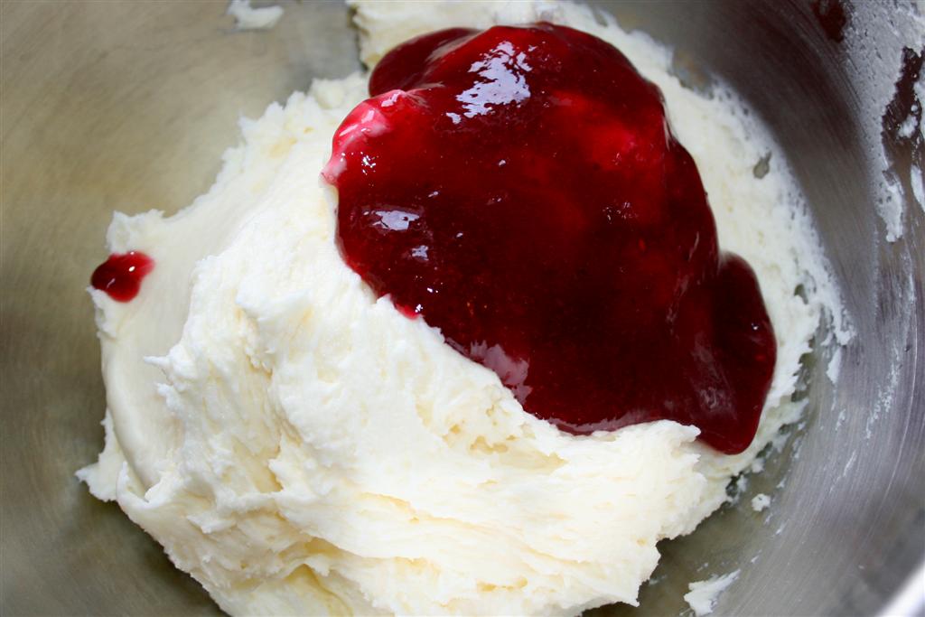 Using a rubber spatula fold in 3.5 oz (100 gr) raspberry jam into the batter.