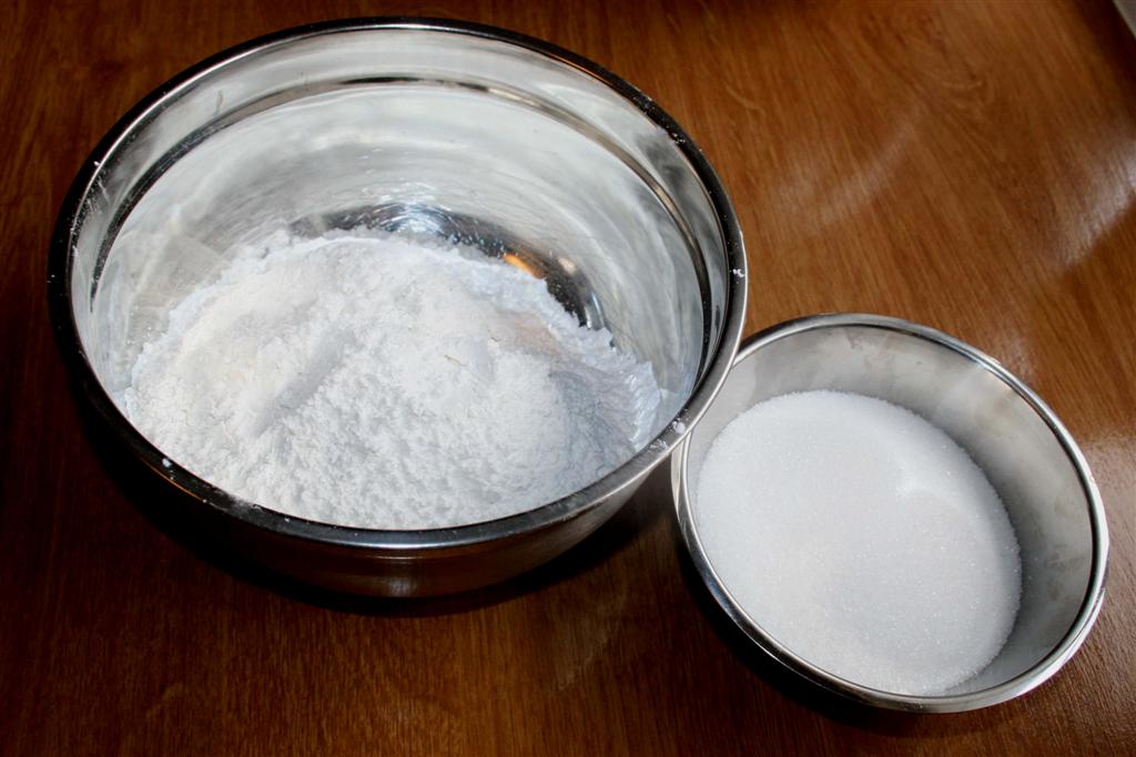 Sikt sammen mel og melis i en bolle for seg. Bruker du vaniljesukker, sikt det i også.