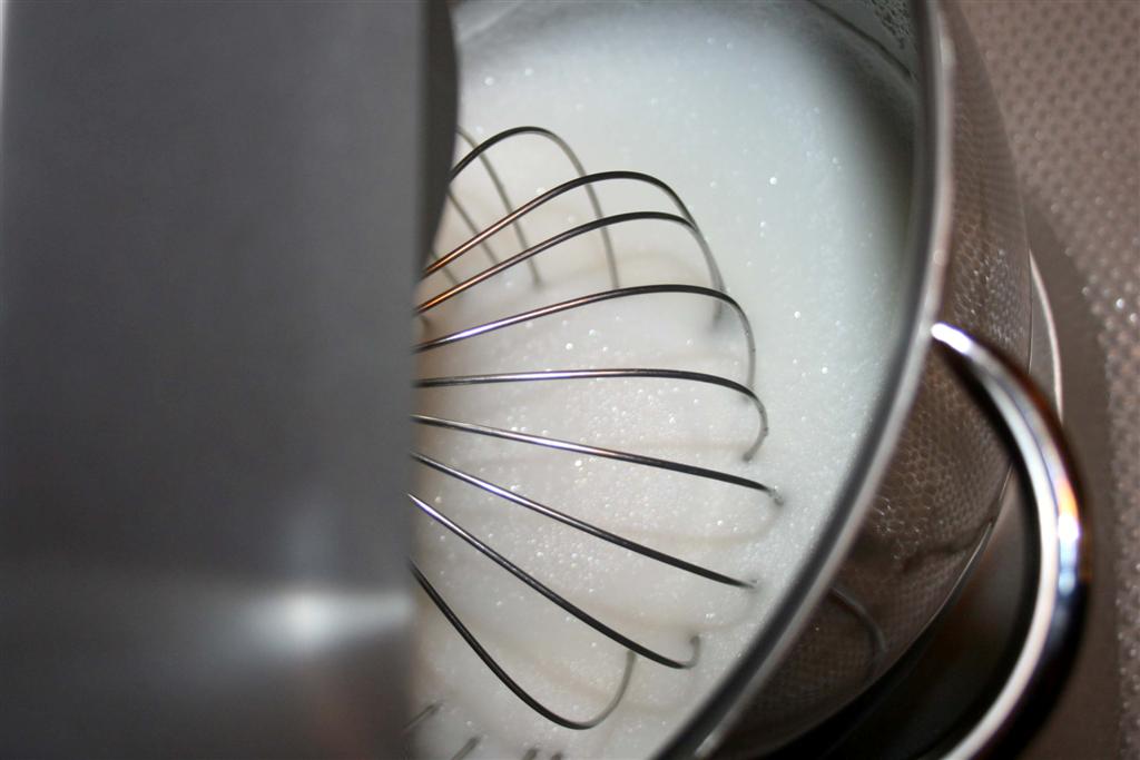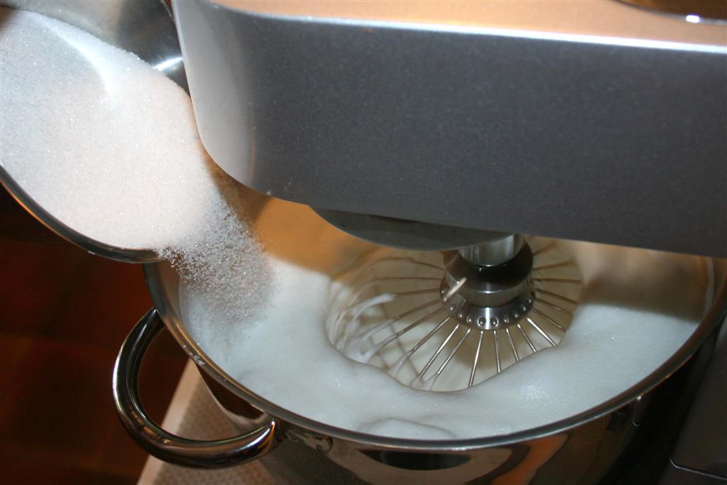 Så tilsettes sukkeret, litt etter litt mens det piskes på full speed.