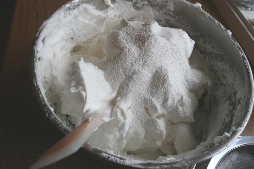 Sikt over 1/3 av melblandingen og fold den forsiktig inn. Så 1/3 til med mel foldes inn og til slutt resten av melet.