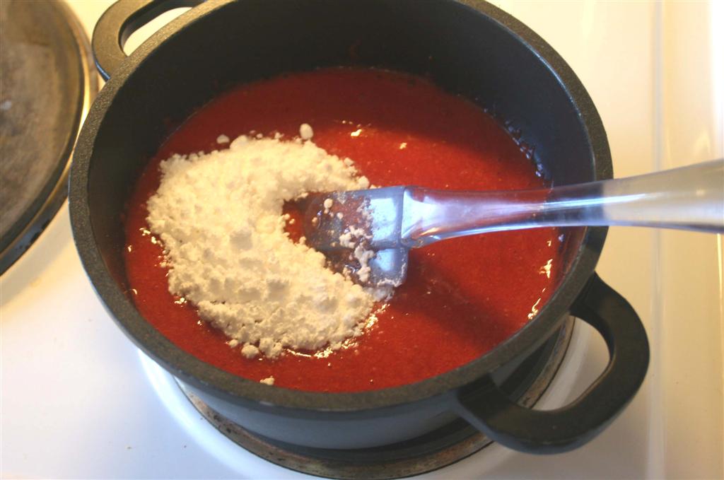 Pour strawberry puree in a small saucepan and set over low heat. Add the powdrered sugar and blend until combined. Let the puree heat until it is hot, but not boiling.