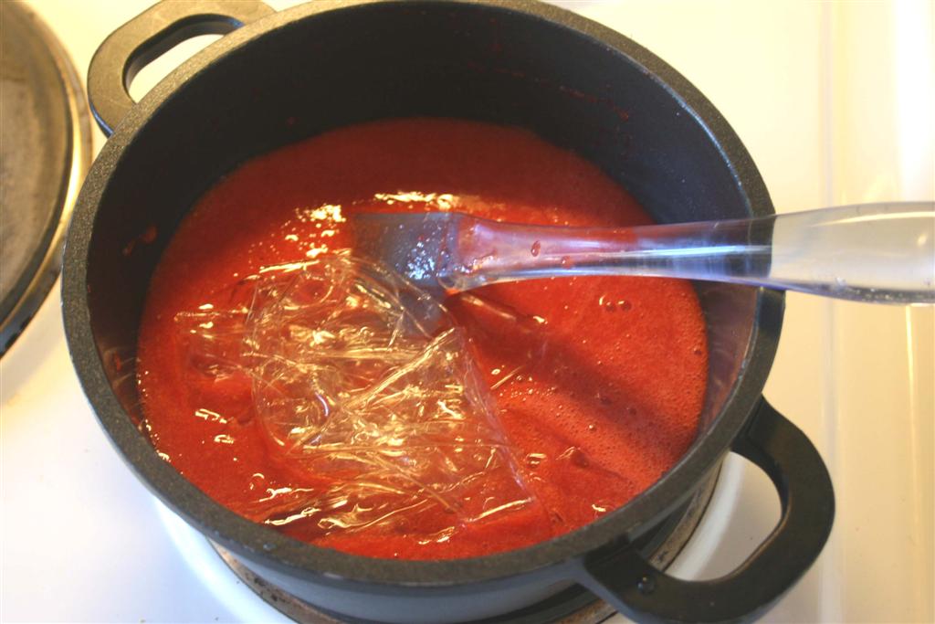 Squeeze as much water from the souked gelantin as you can and add it into the strawberries. Combine and set aside until it cools to roomtemperature.